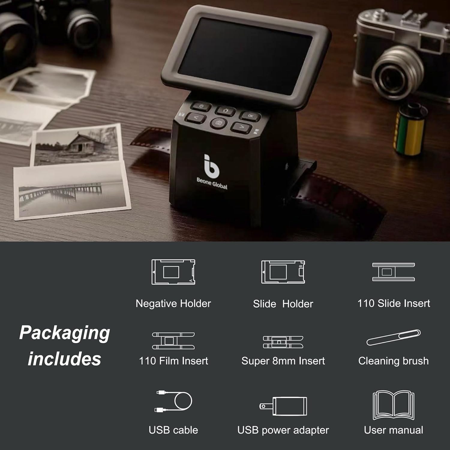 This all-in-one scanner works seamlessly with 126KPK Film, 135 Film, 110 Film, and Super 8 Film, converting them into high-quality 16-megapixel or interpolated 24-megapixel JPEG files in just seconds. With its built-in 128MB memory, you can scan and save even without an SD card—perfect for preserving and sharing your treasured photos instantly.If you need more storage space, please use your own SD card to save additional photos.