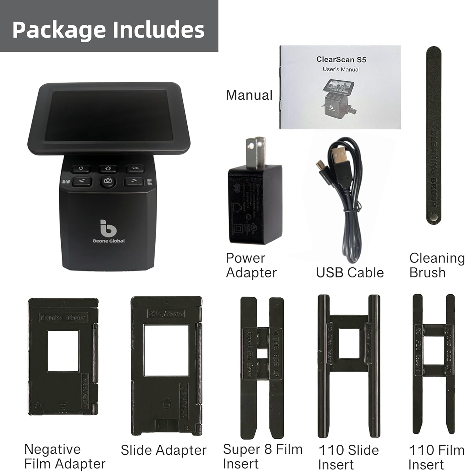 BEONEGLOBAL Clearscan S5 Film Scanner High-Resolution Film&Slide Scanner with 5” LCD – Convert 135, 126, 110 Super8 Negatives and Slides to 24MP Digital JPEG Photos Quickly