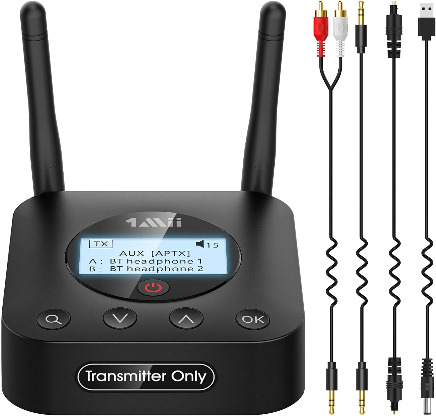 1Mii B06TX+ Long Range Bluetooth 5.2 Transmitter for TV/PC to 2 Wireless Headphones/Speakers, Bluetooth Adapter for TV W/Screen Display Plug N Play, Aptx Low Latency & HD Audio