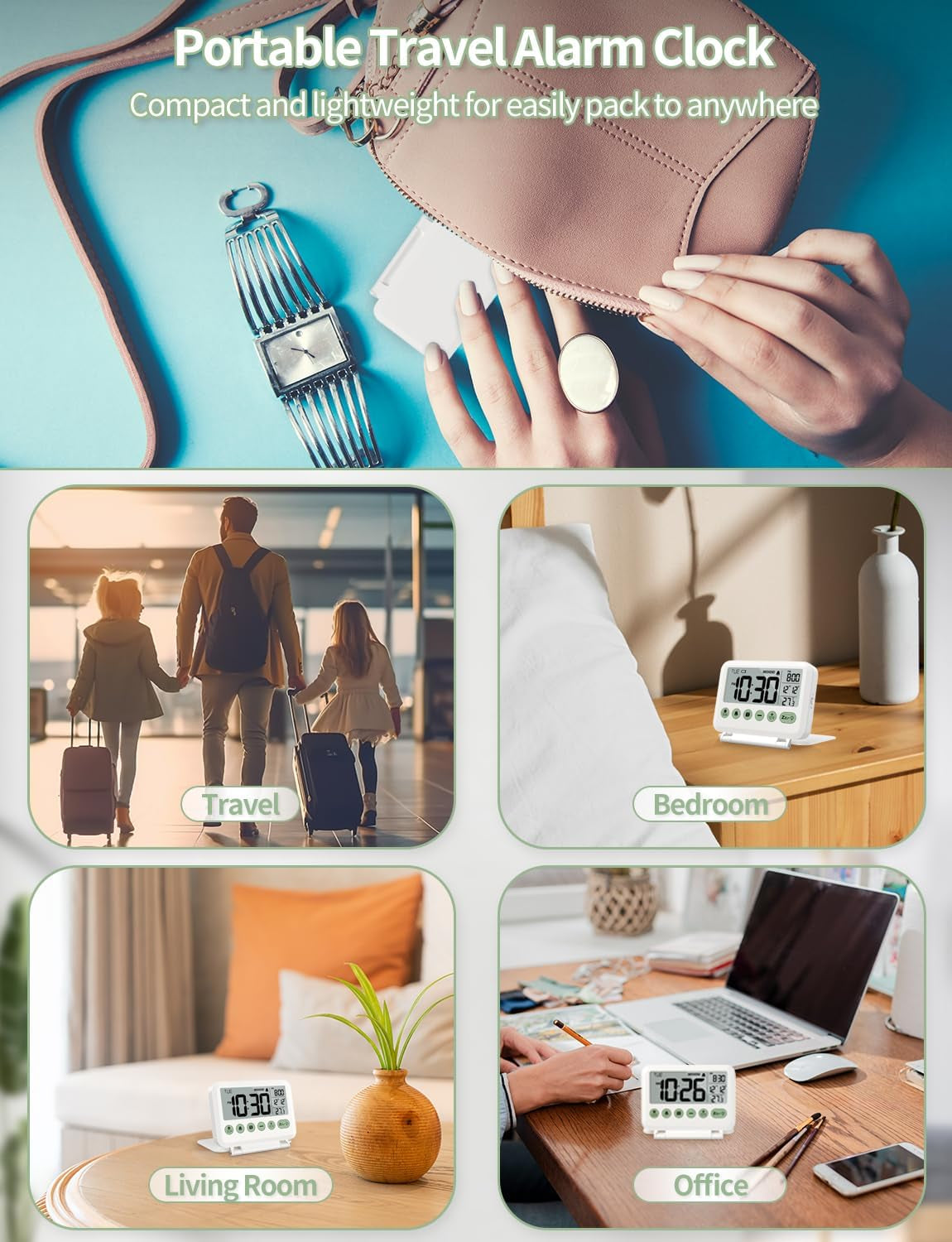 Easy to carry anywhere, this compact digital table clock is so small (4x3.15x0.75in) that it allows you to put it anywhere on your bedside table, nightstand or desk at home and in the office, or carry it in your handbag when you travel.