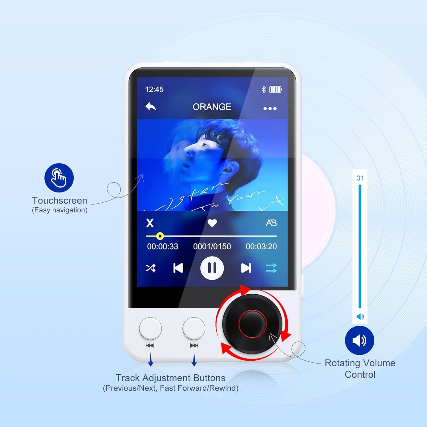 Joliker 128GB MP3 Player with Upgrade Bluetooth 5.3, Portable High Fidelity Lossless Music Player, 2.4IN Full Touchscreen MP3 Player with Built-In HD Speaker, Dual Headphone Ports, FM Radio, Recording, E-Book