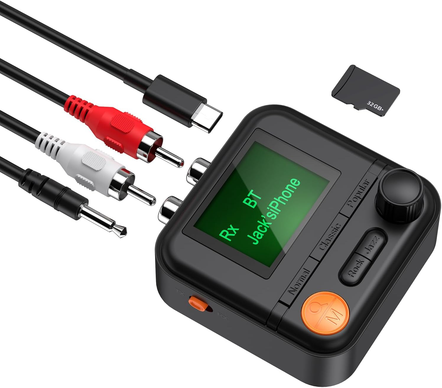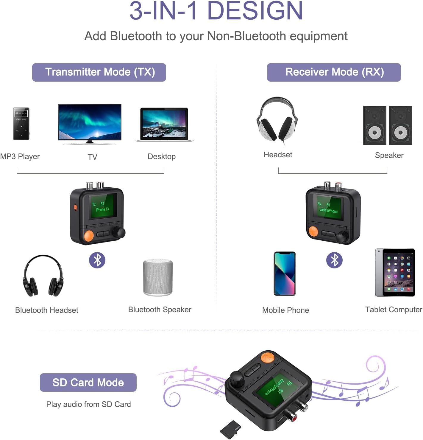 - 2 in 1 Bluetooth Transmitter Receiver: JXTZ aux bluetooth adpater integrates two functions in one: Bluetooth transmitting and Bluetooth receiving. You can play music through Bluetooth connection, but also can parse the audio in the SD card for playback. You can freely choose music EQ according to their preferences, can choose ordinary/rock/pop/classic/jazz 5 music styles;