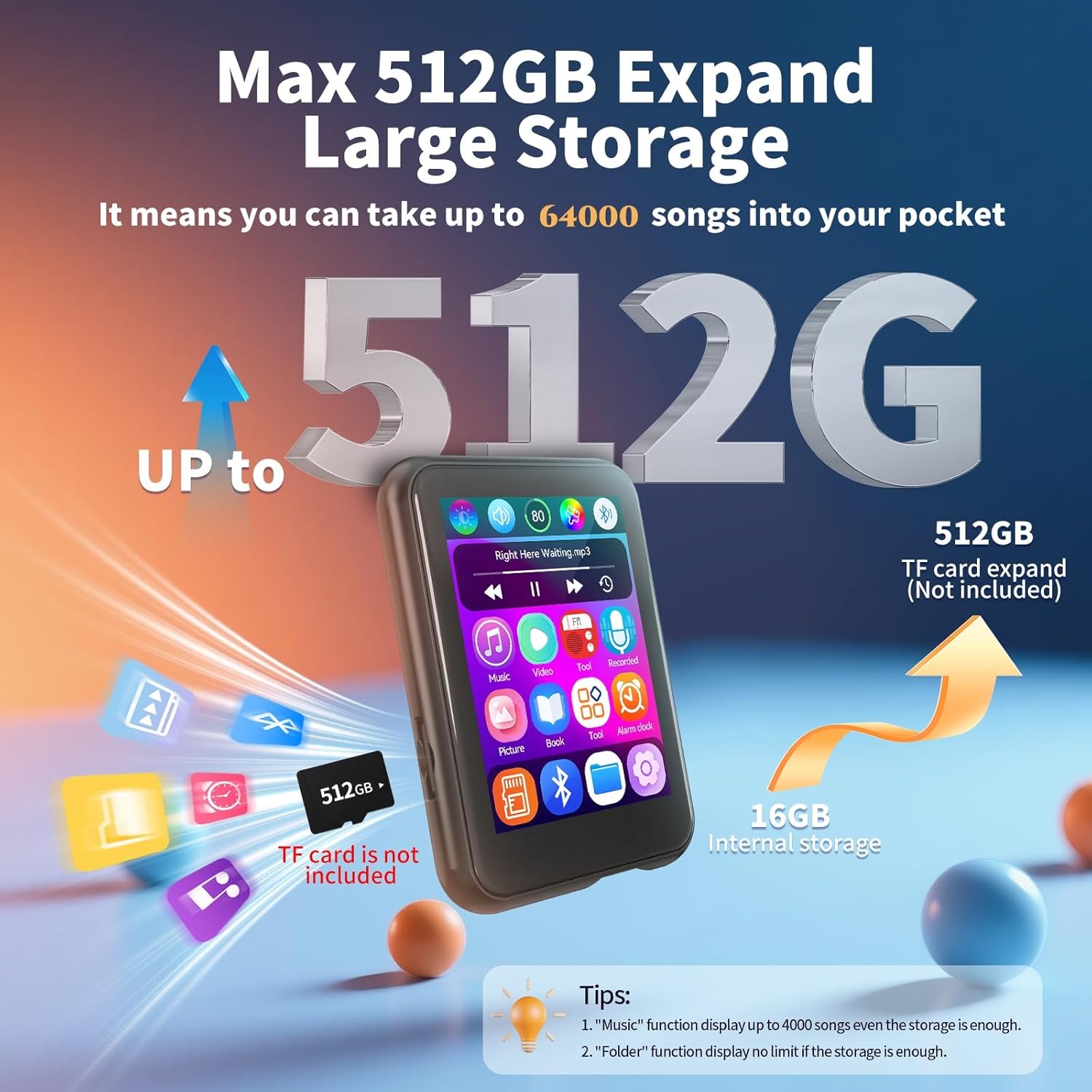 • 【Support SD card up to 512GB】This mp3 player built-in 16GB memory and Micro SD card slot Upgrade support extended memory up to 512GB ,so you can store thousands of songs no need to worry about memory capacity,without wifi and internet(can not compatible with iTunes)