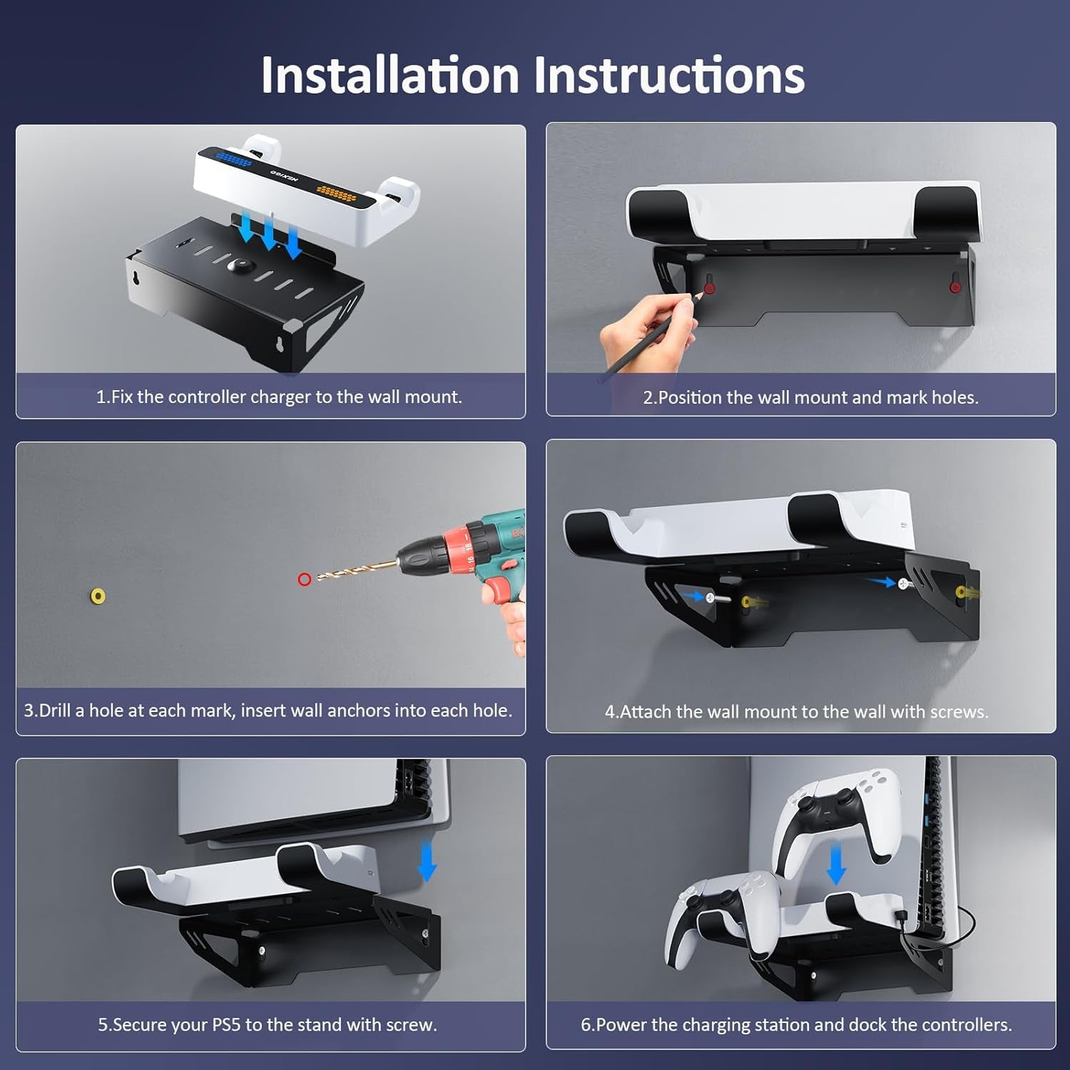 Nexigo PS5 Wall Mount Kit with Charging Station, Dual Controller Chargers, Steel Wall Stand, and Headphone Hanger - Compatible with Playstation 5 (Disc & Digital)