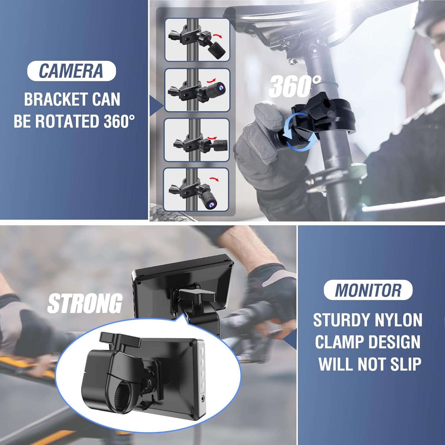• 1080P Enhance Ultra-Bright Display with Bicycle Rearview Camera: With its innovative patented sunshade,experience superior visibility even in direct sunlight with the 4.3-inch monitor, boasting an ultra-bright 1000 nits display. Perfect for outdoor and cycling where screen clarity is essential