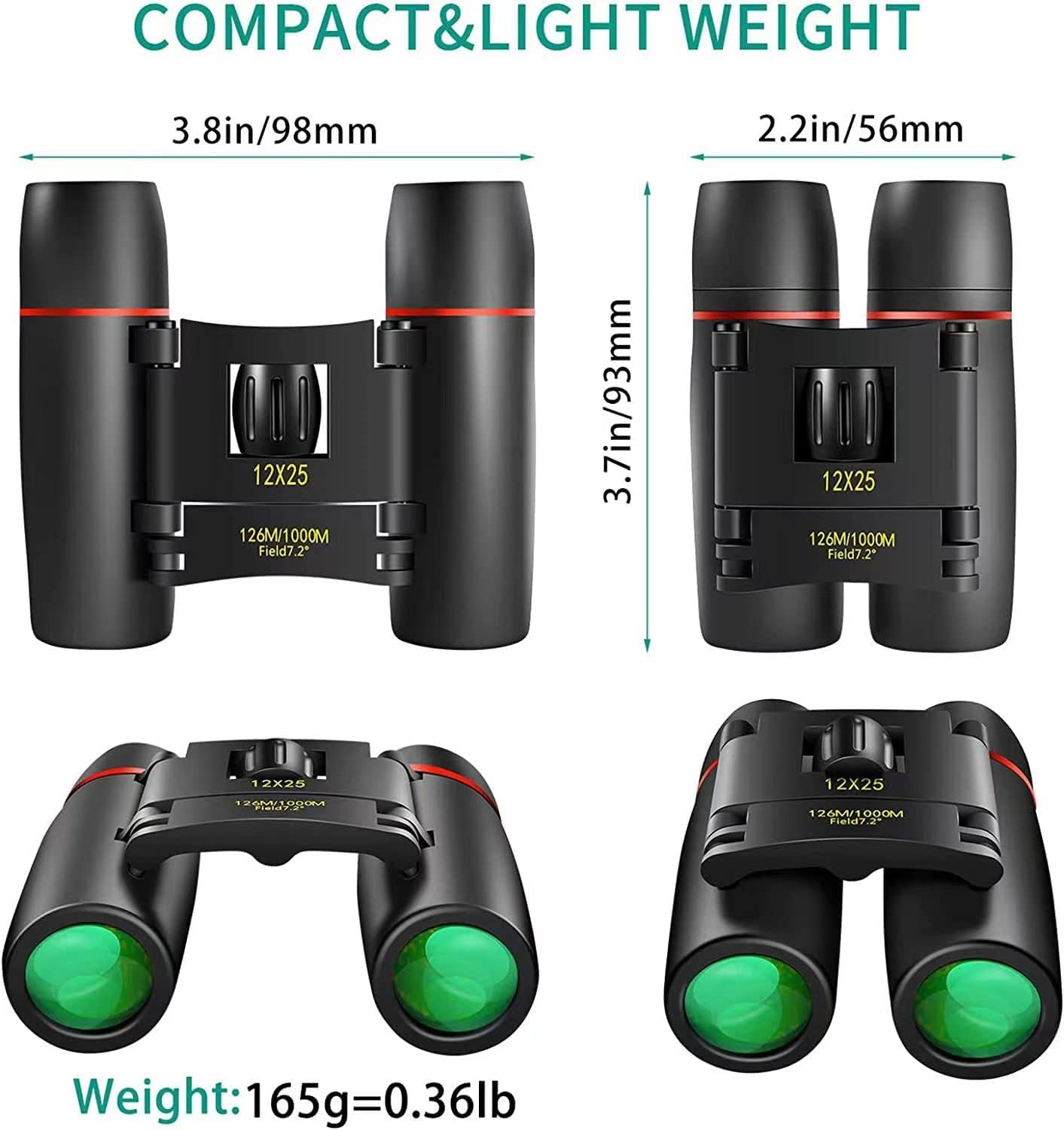 • Compact Binoculars Clear vision: 12x25 optics binoculars with a 12X magnification and objective lens diameter of 25 mm, What's more is with the large field of view-126ft/1000 yards, you can see the entire visual field for capturing objects easily