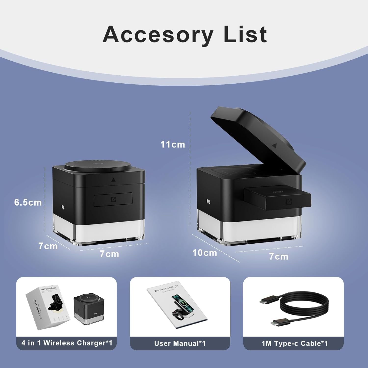 - 【What You Get】4-in-1 wireless charger, 1m USB-C to USB-C cable, user guide.