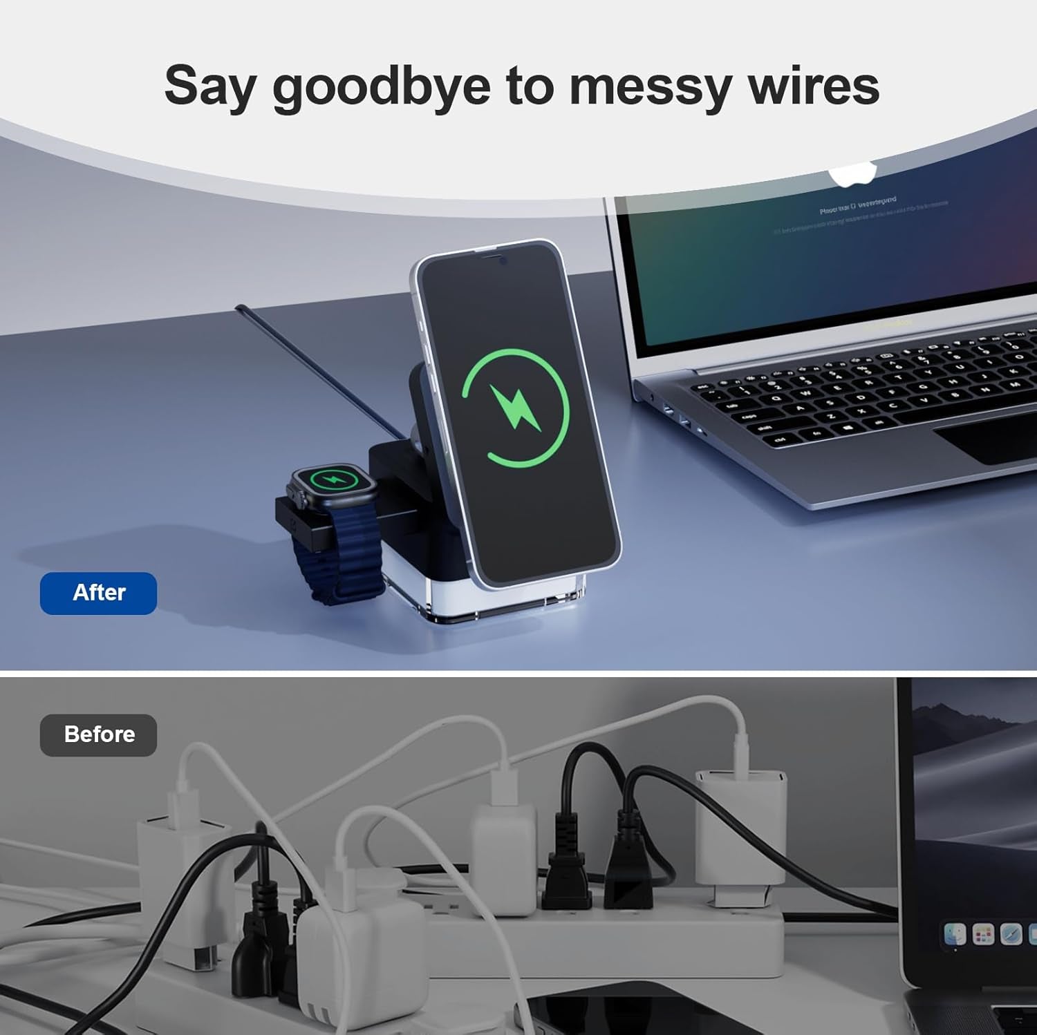 - 【4-in-1 wireless charger】A one-stop wireless charging solution for your iPhone, Apple Watch and AirPods.Say goodbye to messy cables and keep your space neat and tidy, complete with a night light.